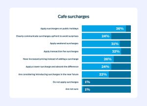 Cafes lead in applying card surcharges at 32% and are also more likely to raise prices quietly at 26%.